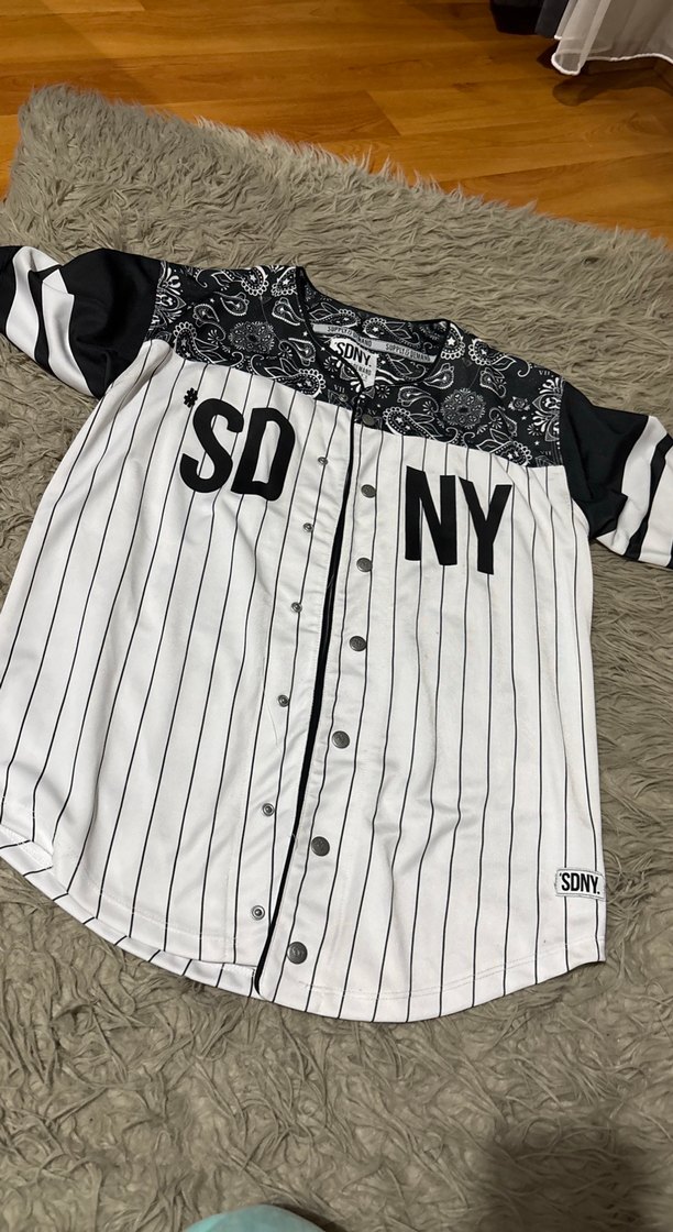 Sentetik kumaştan, kısa kollu, düğmeli ve baskılı desenli erkek jersey. Tekne yaka ve rahat kesim. Beyaz zemin üzerine koyu baskılarla günlük kullanıma uygun. ⚾