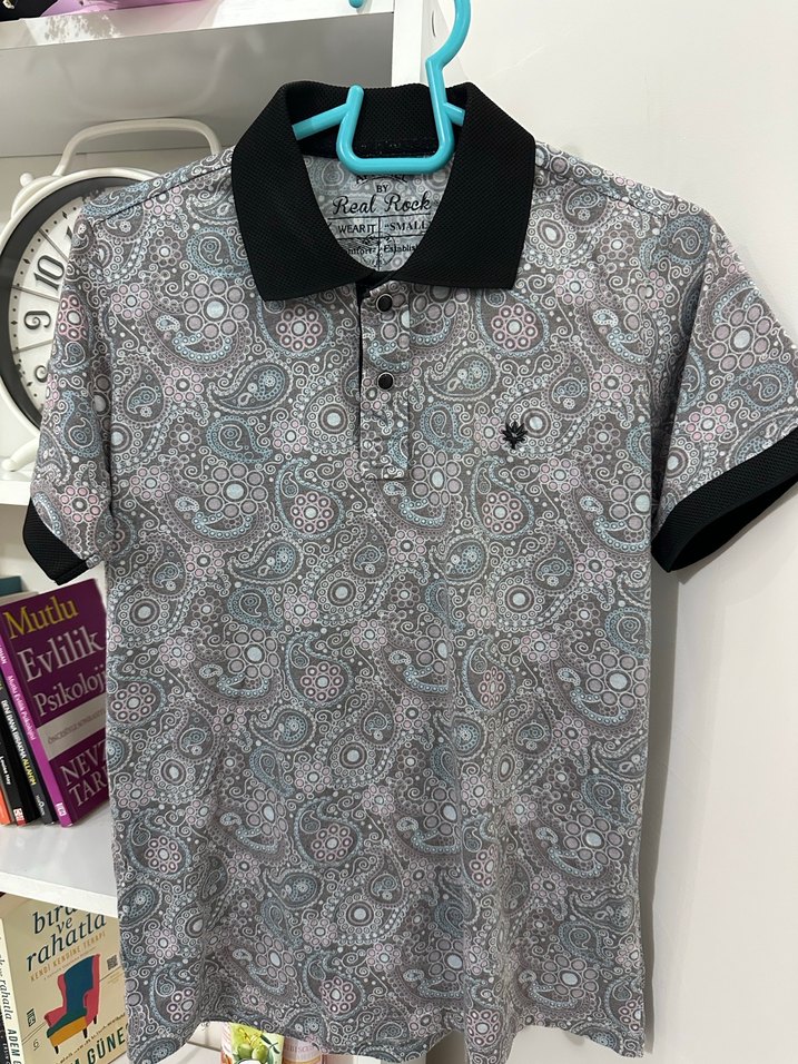 Düğmeli, kısa kollu, yakalı ve baskılı gri desenli erkek polo tişörtü. Sentetik kumaştan, casual ve sokak stiline uygun.