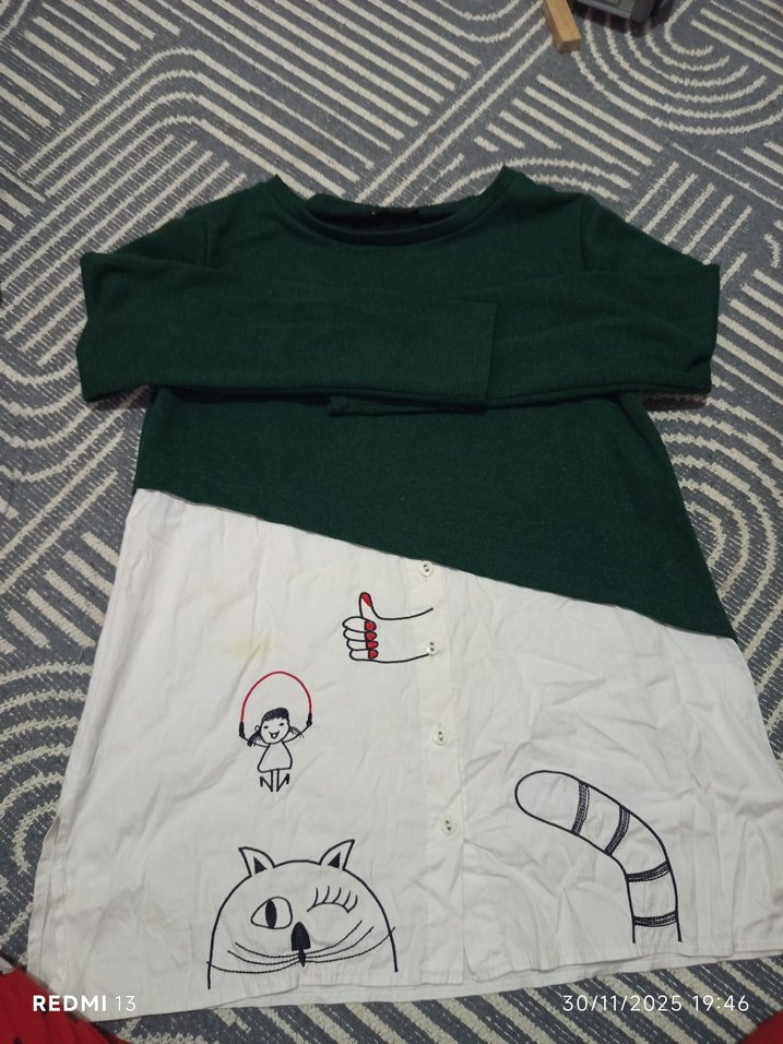 Pamuk kumaştan, uzun kollu, düğmeli ve baskılı hamile elbisesi. Üst kısmı koyu yeşil, alt kısmı beyaz ve rahat kesimlidir. Günlük sokak stili için uygundur.