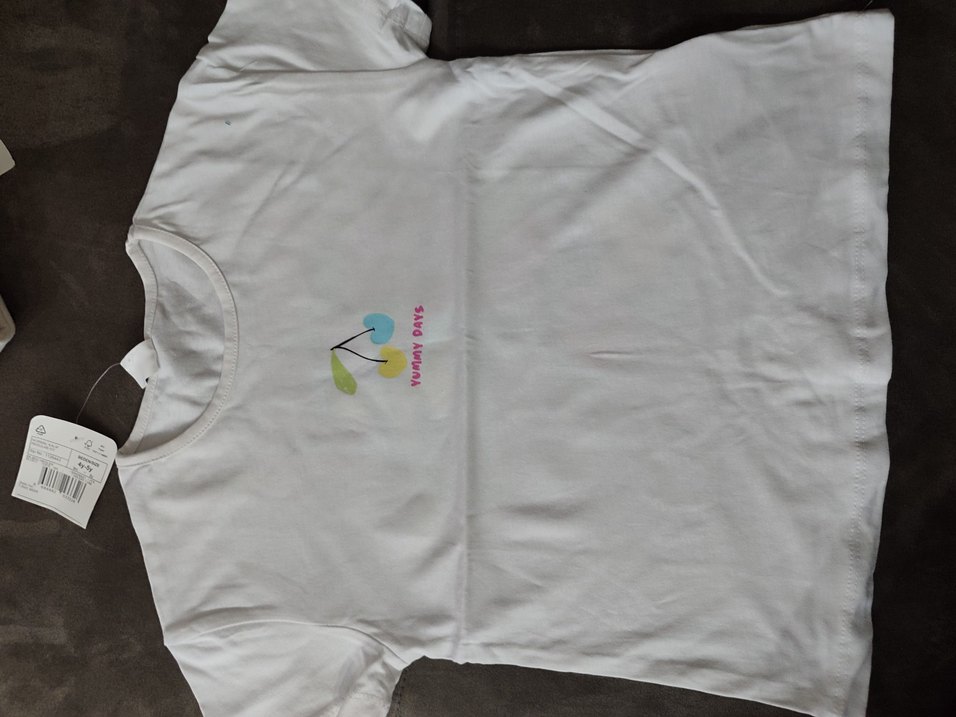 Pamuk kumaştan yapılmış, kısa kollu, yuvarlak yakalı, düğmeli ve pastel baskılı beyaz tişört