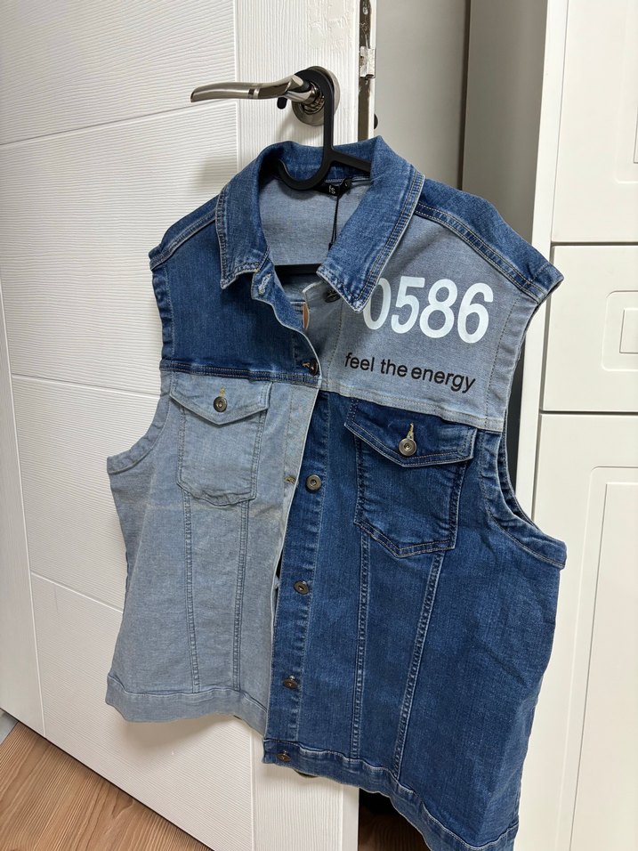 Düğmeli, baskılı ve bol kesimli kot yelek, '6586, feel the energy' yazılı rahat sokak tarzı sunar.