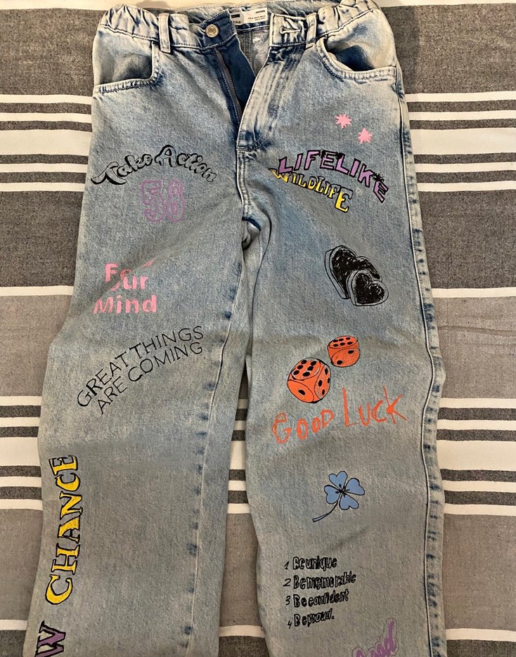 Düğmeli, bol kesim denim pantolon, çok renkli baskılarla süslenmiş. Günlük kullanıma uygun rahat yırtık vs hiçbir defosu yoktur çok az kullanılmıstır.Geri iade yoktur.