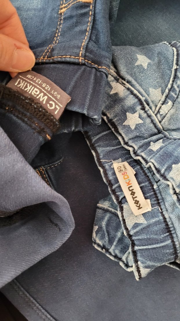 Baskılı yıldız desenli, düğmeli, mavi kot kumaştan, günlük rahat kullanıma uygun dar kesim kadın kot pantolon.