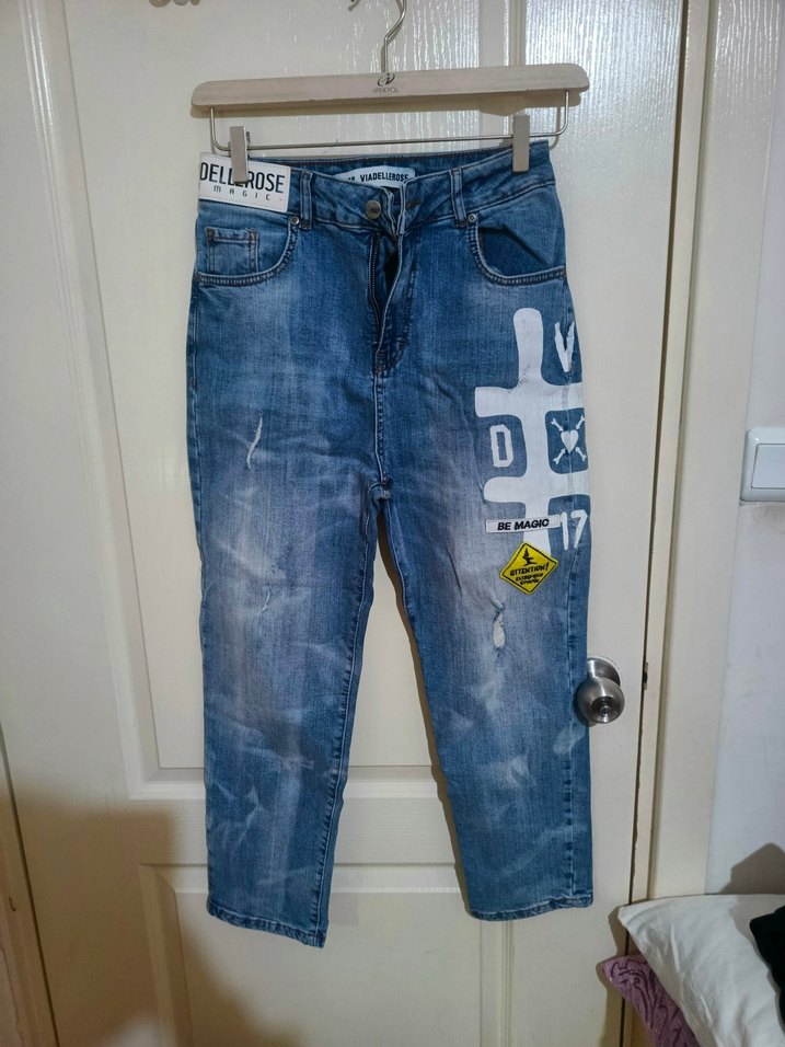 Loose fit kesim, düğmeli kadın kot pantolon. Baskılı detayları ve midi boy uzunluğuyla mavi-gri tonlarda, günlük sokak stili DELLROSE markası.