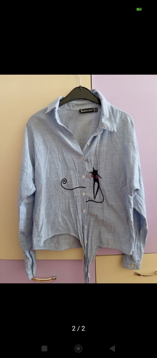 Mavi-gri keten kumaştan, düğmeli, yakalı, uzun kollu ve baskılı desenli bol kesim gömlek. Günlük sokak stili için uygundur.