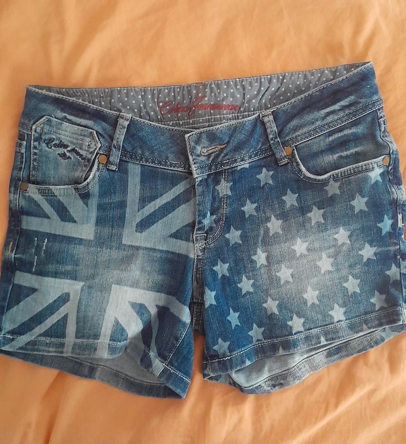 Düğmeli, baskılı yıldız ve bayrak desenli mavi mini denim şort, rahat sokak stili için uygun.