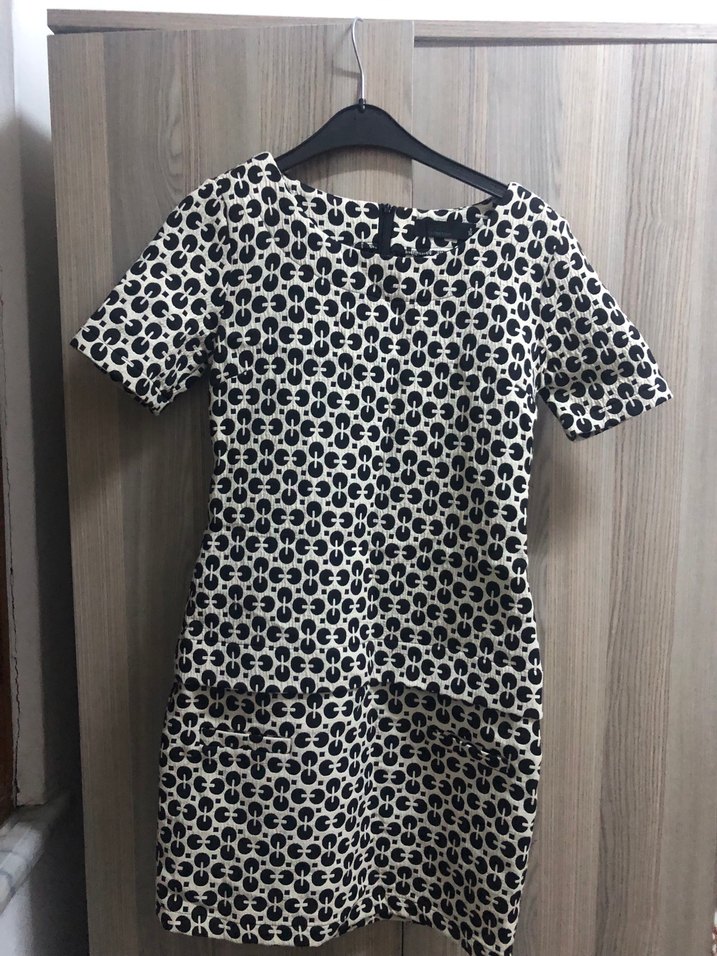 Kısa kollu, bisiklet yaka ve düğmeli detaylı, renkli baskılı, vücuda oturan midi elbise.