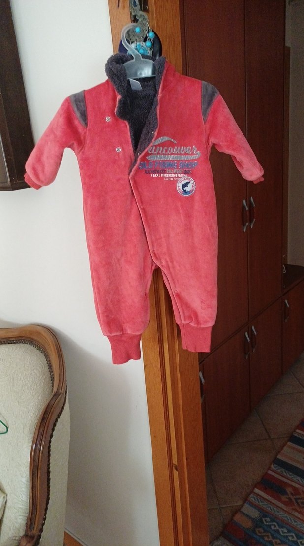 Düğmeli ve baskılı, pembe ve gri renkte bebek tulumu. Yumuşak ve sıcak kumaştan üretilmiş, yakası kesik yaka şeklindedir. ❄️