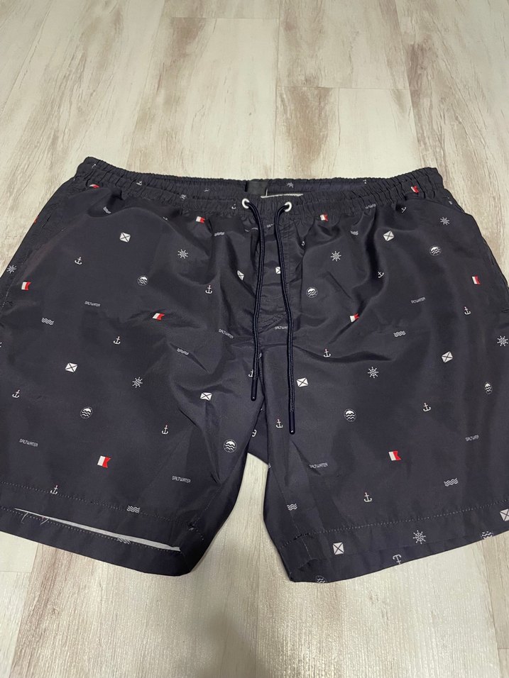 Düğmeli, baskılı deniz desenli siyah erkek şortu, plaj ve gündelik sokak tarzı için uygundur.