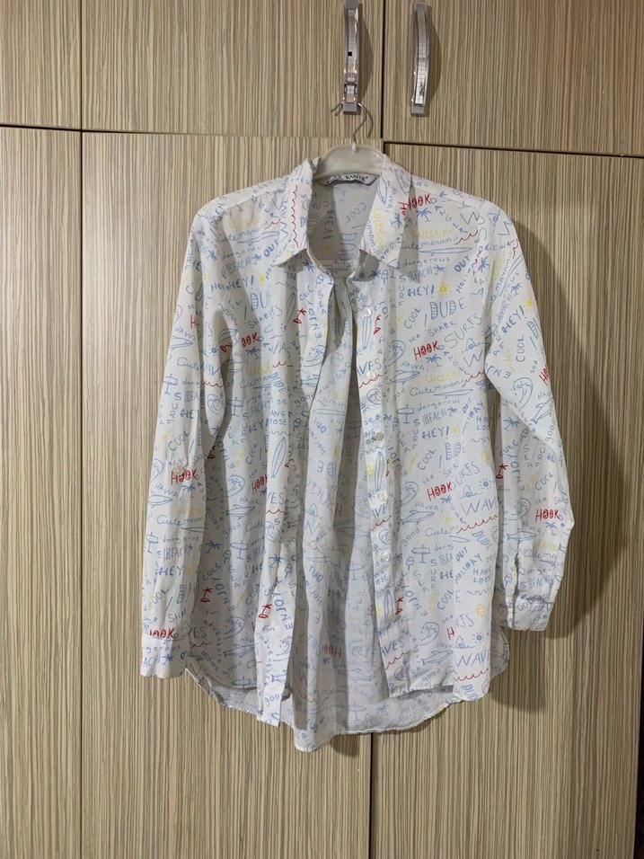Beyaz keten gömlek, uzun kollu ve düğmeli tasarıma sahiptir. Baskılı ve bol kesimiyle günlük sokak stiline uygundur.