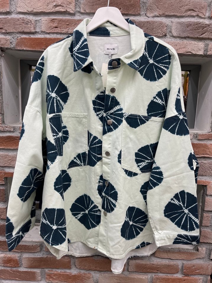 Düğmeli ön kısmı ve batik desenli, uzun kollu, notched lapel yakalı bol kesim kadın gömlek. Tekstil malzemeden, günlük sokak stili için uygun.