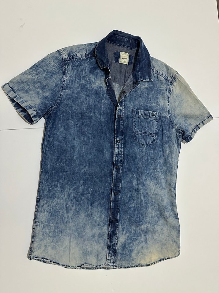 Erkekler için düğmeli, kısa kollu, yakalı kot gömlek. Mavi ve gri tonlarında batik desenli, bol kesim, günlük sokak tarzı için uygun.