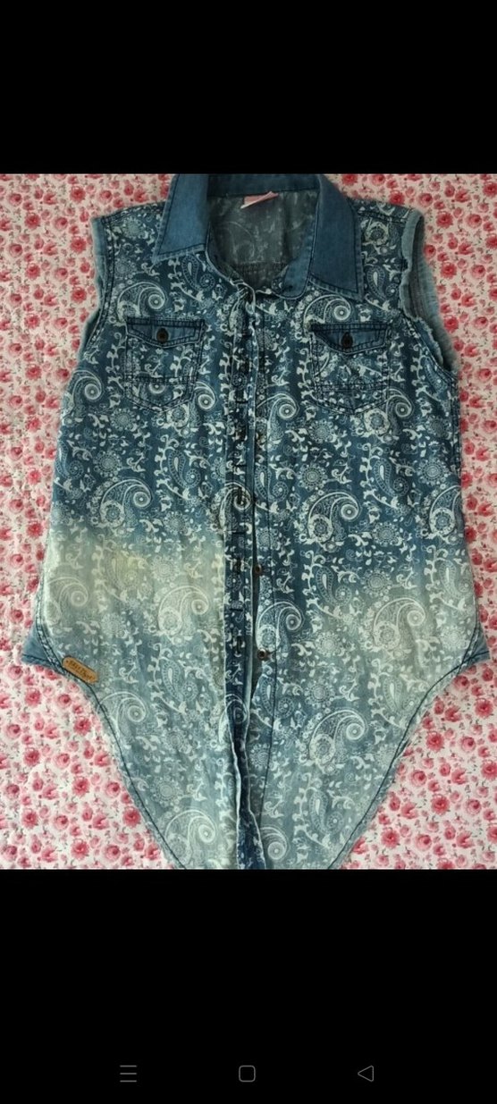 Düğmeli, kolsuz ve batik desenli kız çocuk gömlek. Mavi ve gri tonlarında, bol kesim ve midi boyda, bohem tarzı için uygun.