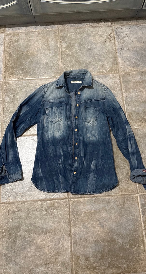 Mavi kot gömlek, düğmeli ön, uzun kollu ve kesik yaka detaylarına sahiptir. Batik desenli, bol kesim ve günlük rahat sokak stili için uygundur. Yumuşak tarz