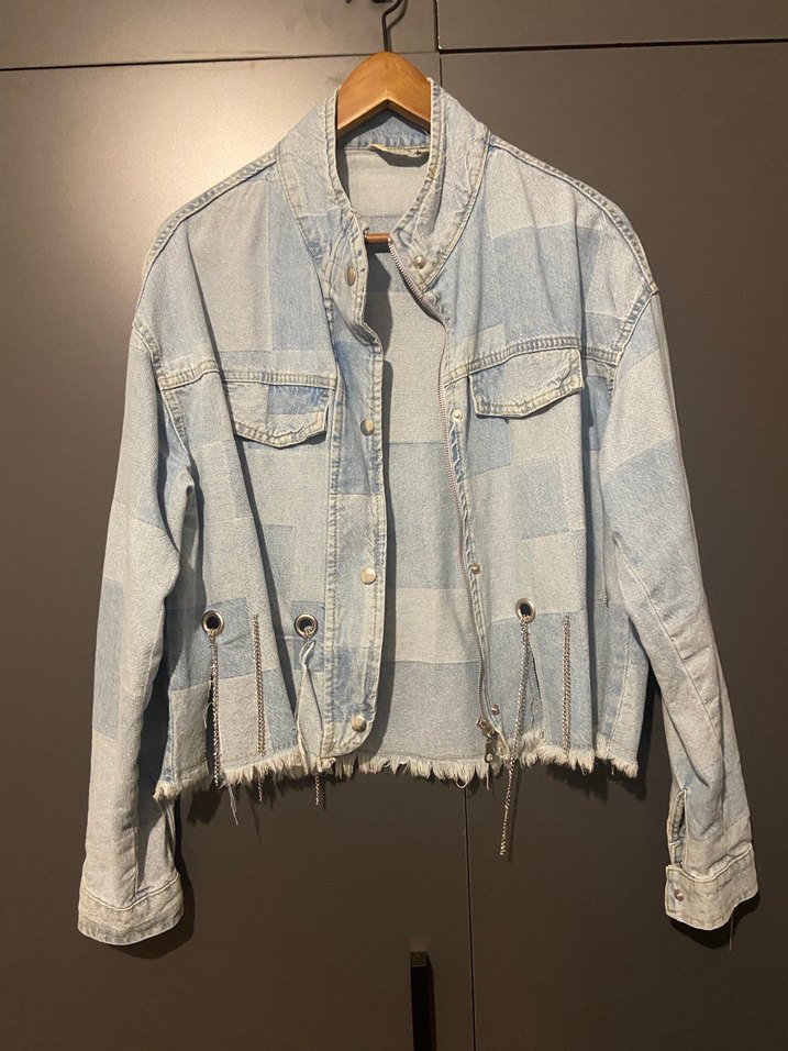 Uzun kollu, düğmeli, notched yaka mavi denim ceket. Batik desenli ve uçları dağınık, rahat kesimle sokak stiline uygun.