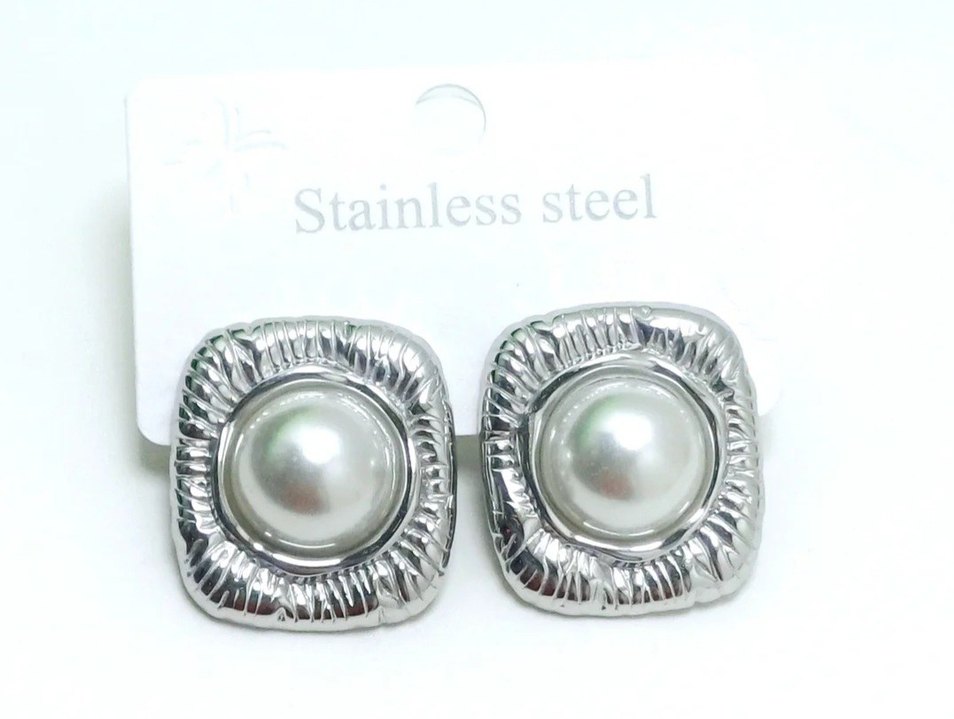 Düğmeli, parlak beyaz renkte vintage tarzda bayan küpeleri. Paslanmaz çelikten üretilmiştir ve düğün için uygundur. Midi uzunluktadır.