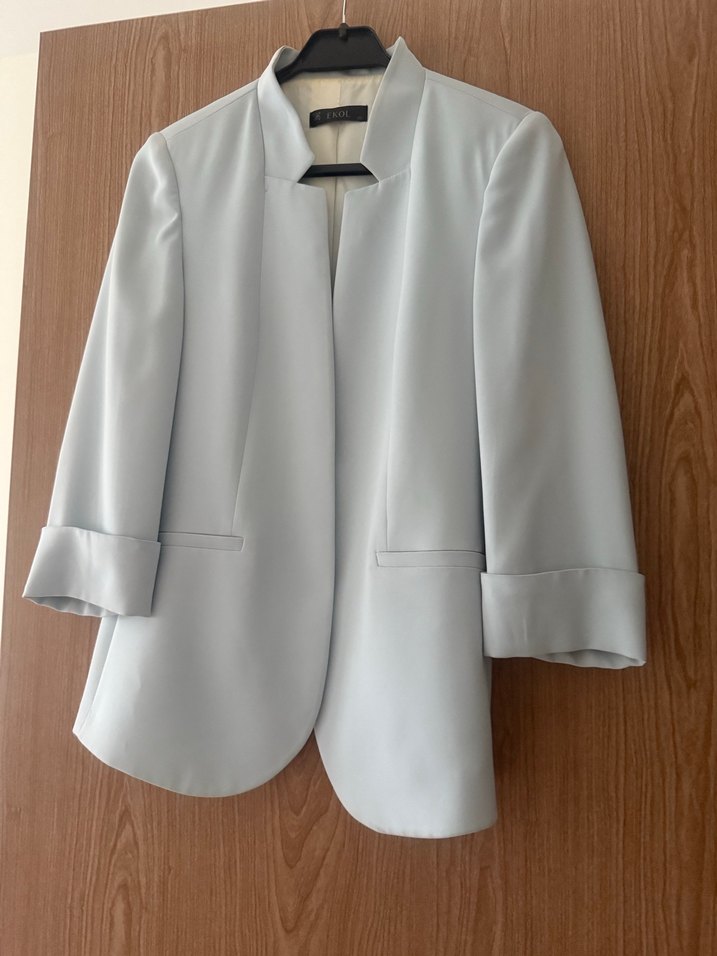 Kadınlar için düğmeli, kısa kesim beyaz blazer ceket. İpek gibi kumaştan, uzun kollu ve klasik modern tarzda, ofis kullanımı için uygundur.