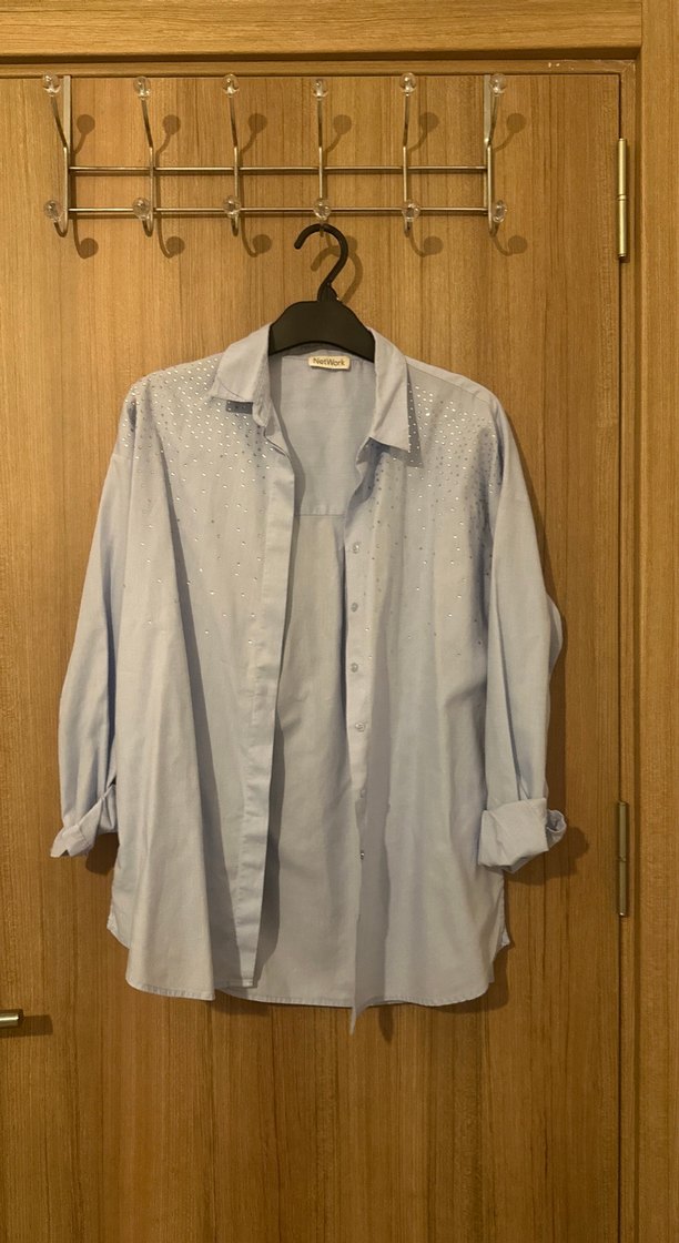 mavi , düğmeli, yakalı ve uzun kollu keten kumaştan yapılmış, bol kesim midi uzunlukta kadın gömlek. Rahat ve gündelik tarz için uygundur.