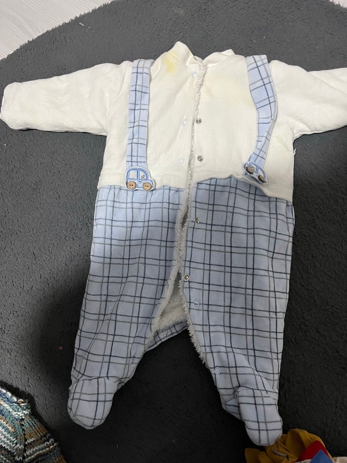 Beyaz ve gri renklerde, düğmeli ve yumuşak, sıcak tutan kumaştan yapılmış bebek erkek tulumu.