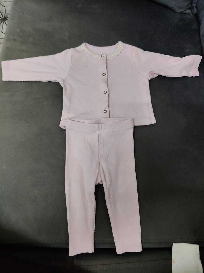 Düğmeli, uzun kollu bebek kız takımıdır. Pastel tonlarıyla sade ve yumuşak bir görünüme sahiptir.
