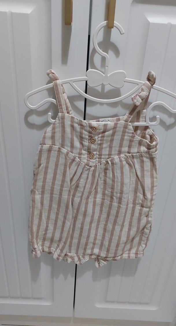 Bej renkli, pastel çizgili ve düğmeli ön kısmı olan bebek kız tulumu. Ayarlanabilir askılar ve toplanmış detaylarla yumuşak kumaş.