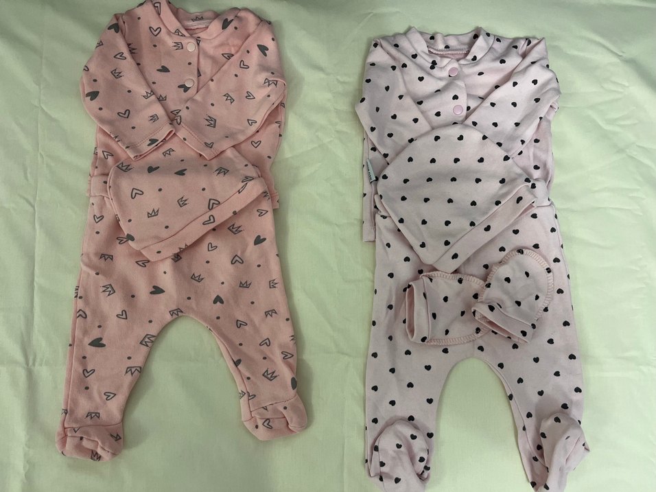 Desenli ve düğmeli, pastel pembe renklerde bebek kız tulumları. Yumuşak kumaş, hassas ciltler için uygundur. 2 adet hastane çıkışı seti Yenidoğan