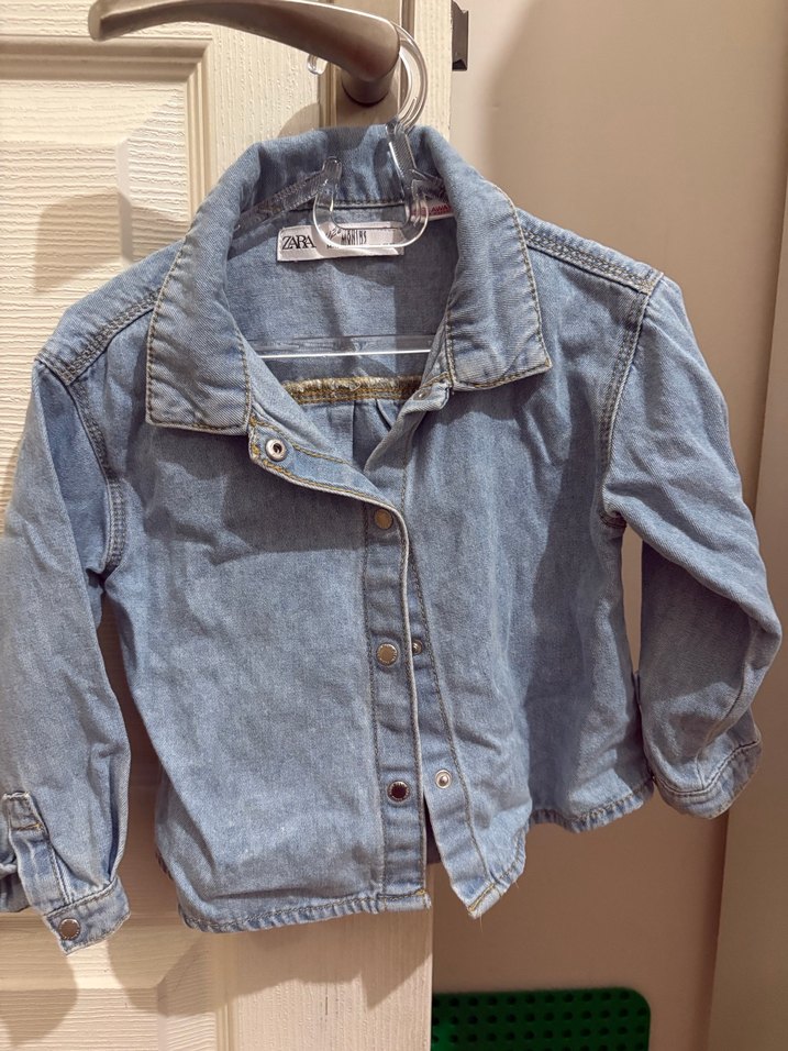 Düğmeli ön, uzun kollu ve kesik yakalı bebek mavi denim gömlek. Salaş kesim ve midi boyda, günlük sokak stiline uygun. Tek renk, rahat kullanım için ideal.