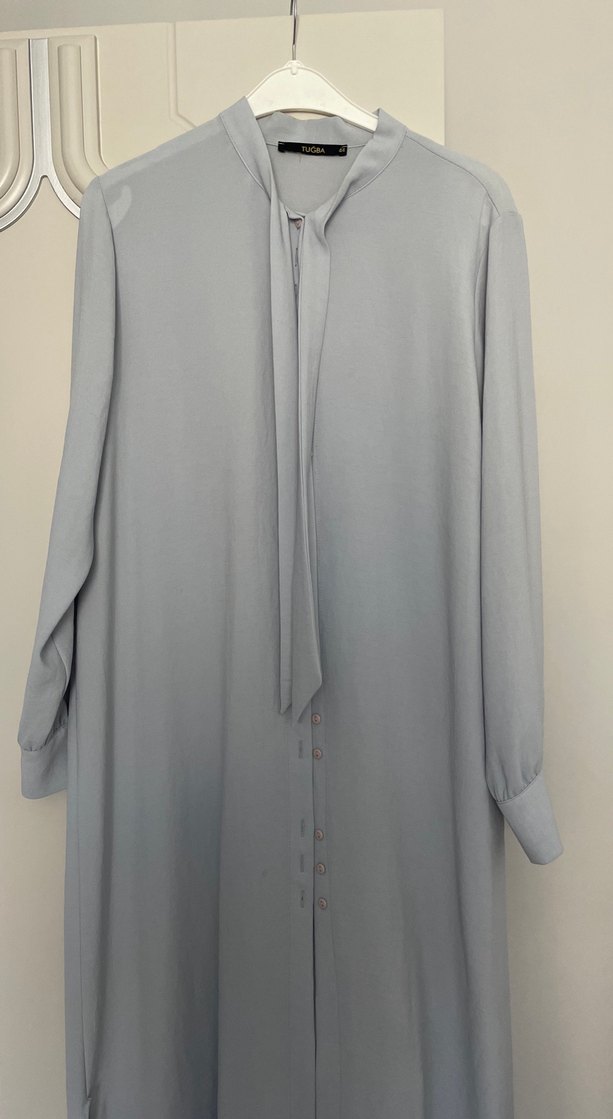Bebek mavisi renkte, yakalı ve düğmeli uzun kollu, bol kesim kadın elbisesi. İpeksi dokusuyla özel ve gündelik için minimalist ve şık bir tercih.