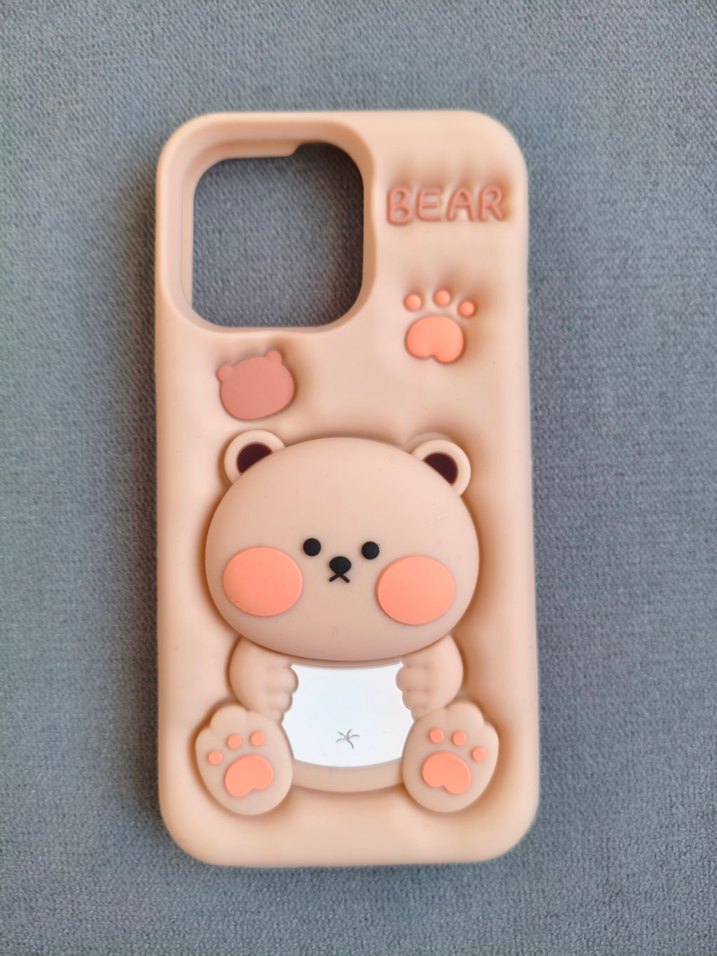 Pastel bej renkli, düğmeli 3D ayıcık figürlü telefon kılıfı. "BEAR" yazısı bulunur, yumuşak dokulu ve koruyucudur. İPhone 15 pro Max