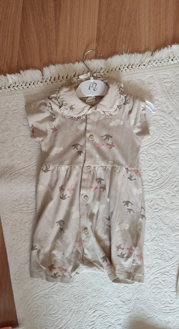 Bej renginde, pastel baskılı, düğmeli ve yumuşak kumaştan yapılmış bebek kız tulumu. Yakası sevimli detaylıdır.