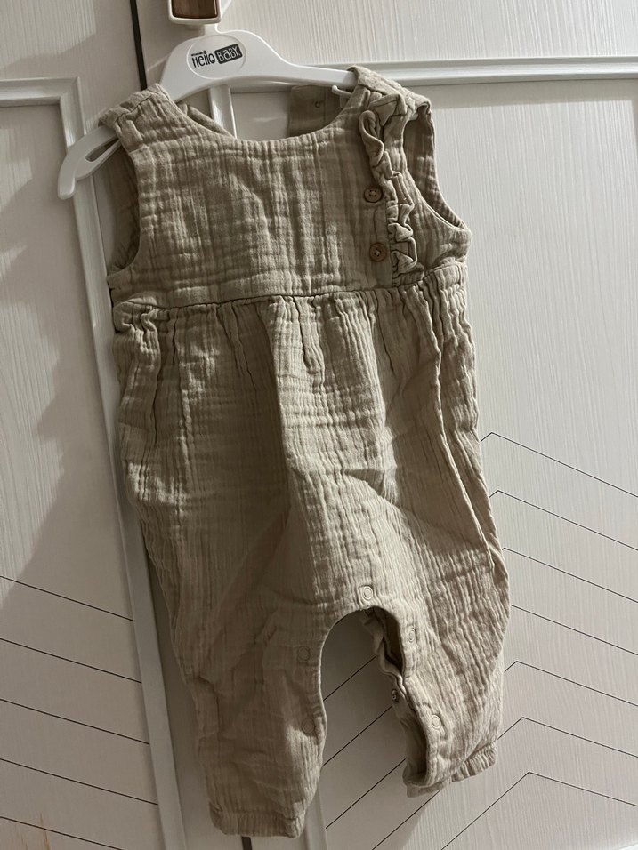 Önden düğmeli, bej renkli bebek kız tulumu. Yumuşak, dokulu kumaştan üretilmiştir. Kolsuz ve desensiz tasarım.