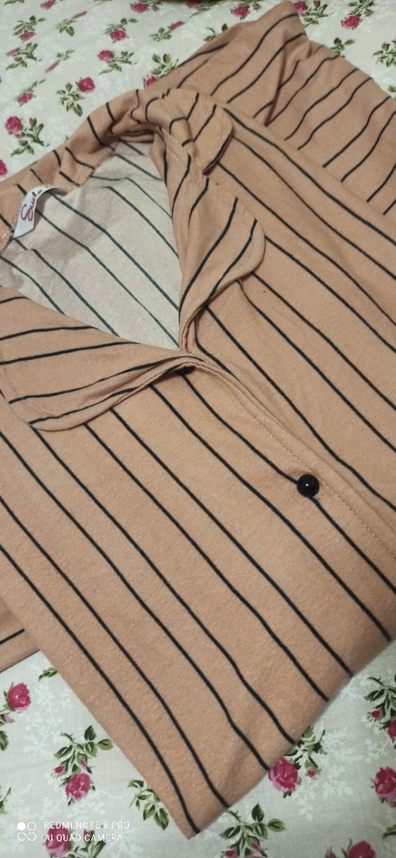 Düğmeli ön kısmı ve kesik yaka detayı olan bej çizgili kadın gömleği. Uzun kollu, normal kesim ve yumuşak sentetik kumaştan üretilmiştir. Günlük rahat kullanıma uygundur. Bayan süet pijama