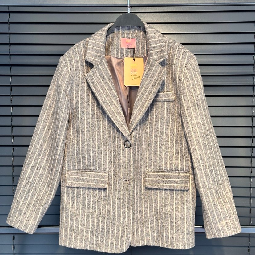 Kahve yün kumaştan, düğmeli, çizgili desenli, normal boy, uzun kollu, notched yaka kadın oversize ceket. Ofis ve günlük kullanımı için uygundur. S-M-L bedenleri bulunmaktadır