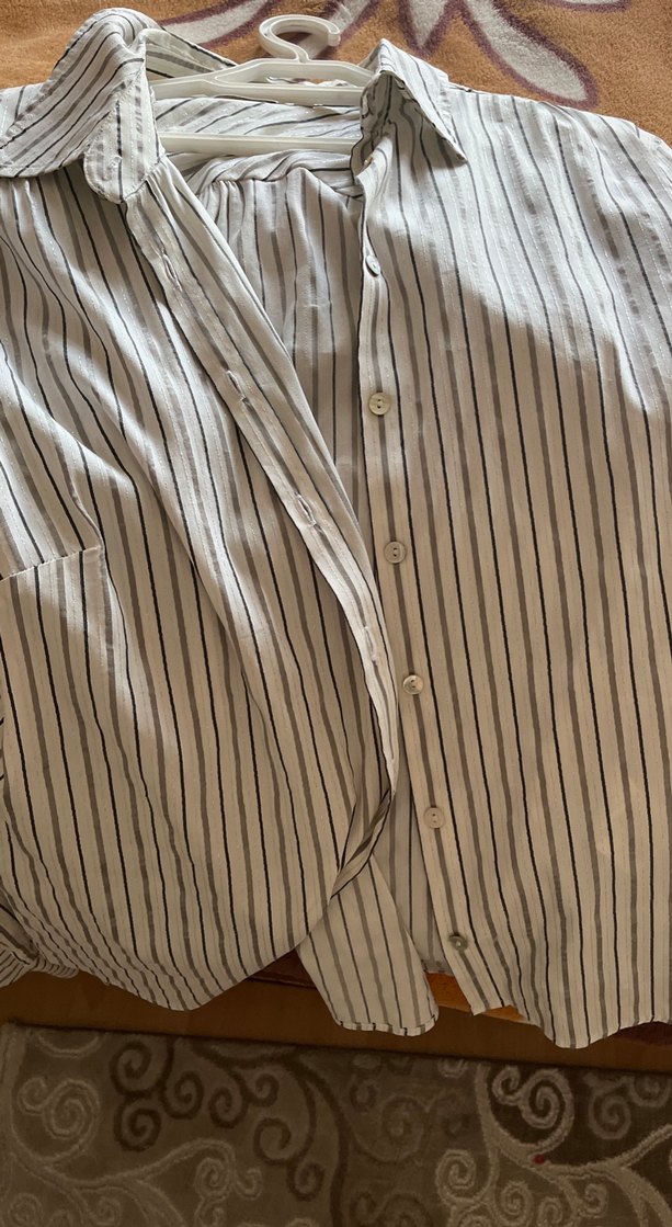Düğmeli ön ve yakalı bej renkli keten gömlek, ince dikey çizgilerle. Salaş kesim, askılı kısa kollu ve midi boyda, günlük kullanıma uygun. Işıltılı sık görünüm