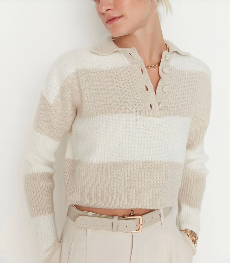 Düğmeli Bej Çizgili Triko Kadın Kazak