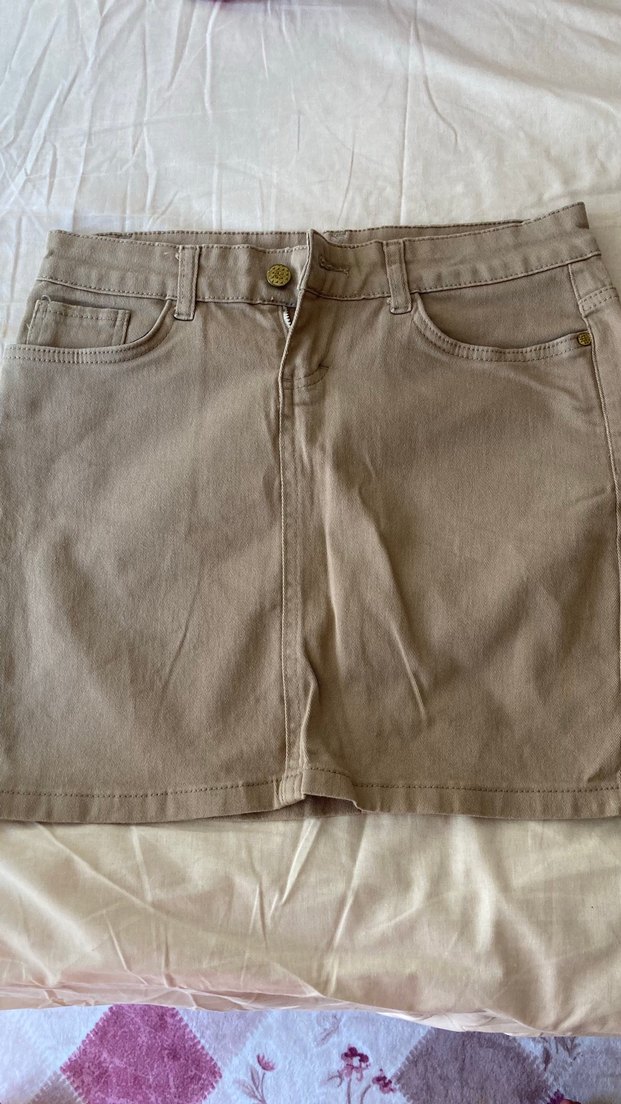 Düğmeli Bej Denim Mini Etek