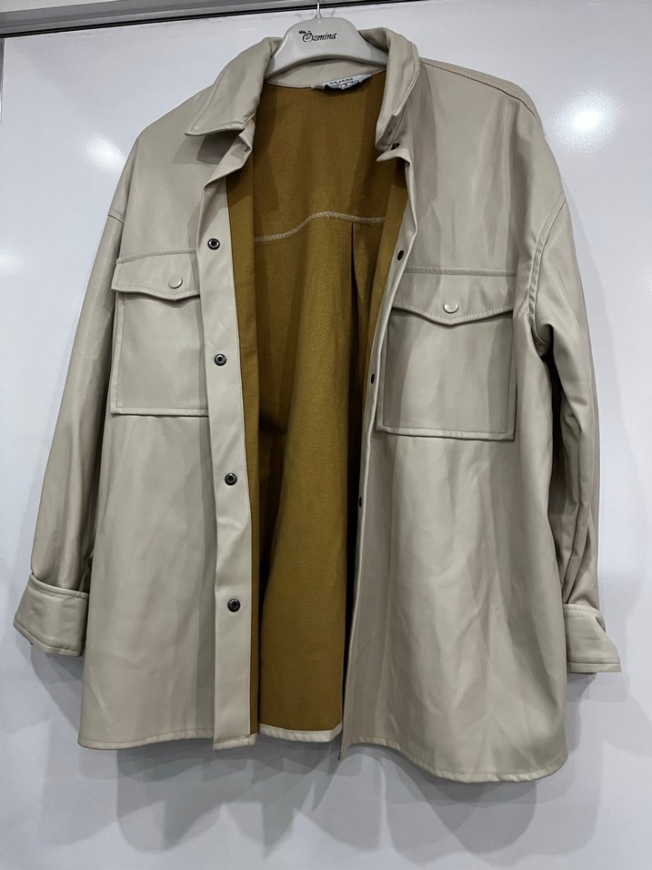 Düğmeli, uzun kollu, bej deri kadın ceket. Rahat kesimi ve çıtçıtlı ön cepleriyle günlük kullanıma uygun.