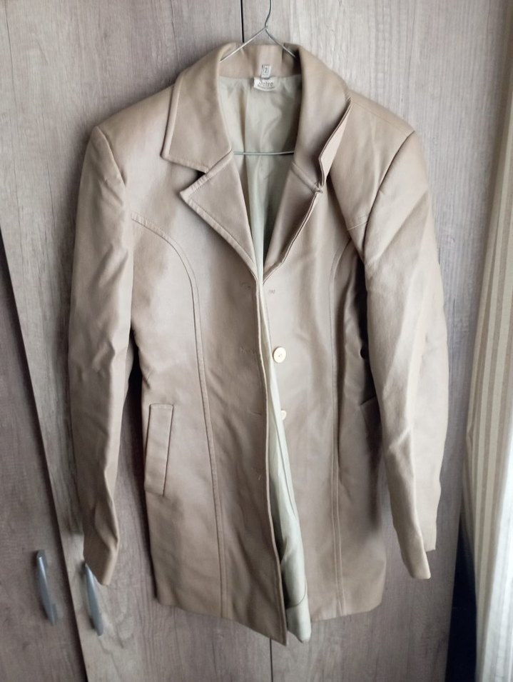 Bej deri ceket, düğmeli ve kesimli yaka detaylıdır. Uzun kollu ve midi boy, minimalist sokak stili ile günlük kullanıma uygundur.