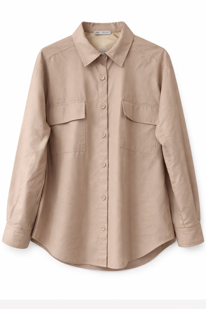 Bej renkli kadın gömlek, düğmeli ön ve kesimli yaka detayına sahip. Deri malzemeden, uzun kollu ve normal midi boyda, sade ve minimalist tarz sunar. Sadece 2 kere giydim