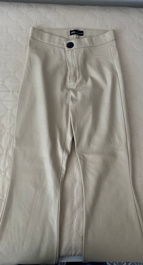 Düğmeli Bej Deri Kadın Pantolon