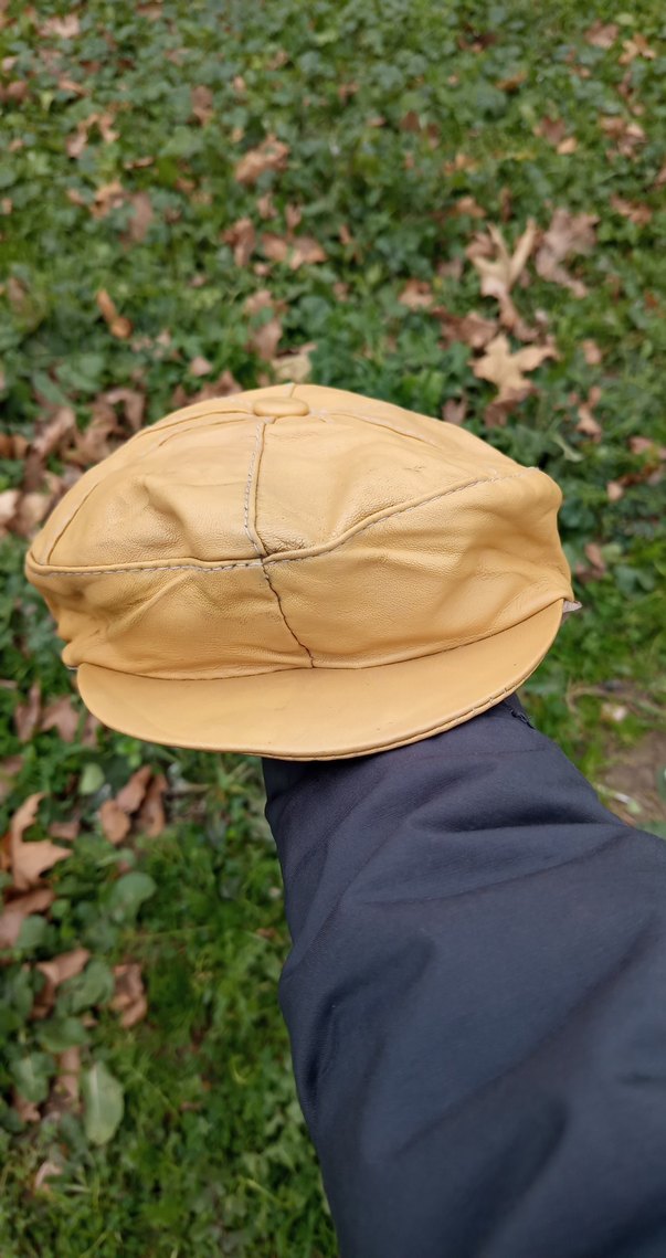 Düğmeli detaylı, parlak bej hakiki deri kadın şapkası, vintage Paris tarzını yansıtıyor.