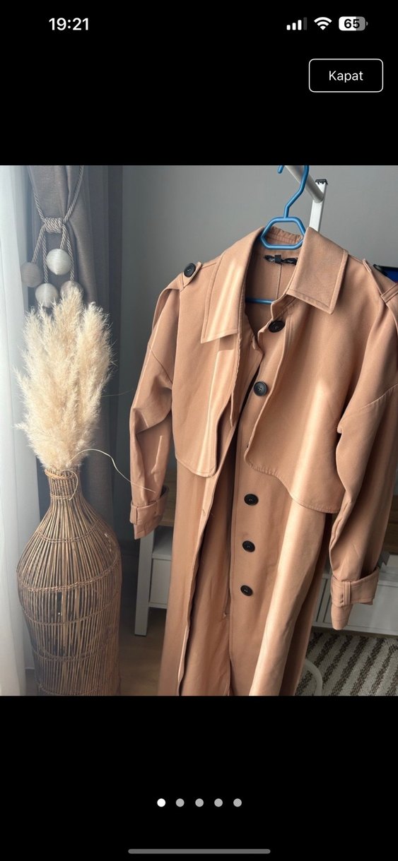 Uzun bej deri trençkot, düğmeli ve kesik yaka detaylıdır. Parlak yüzeyi ve rahat kalıbıyla günlük ve iş stiline uygundur.