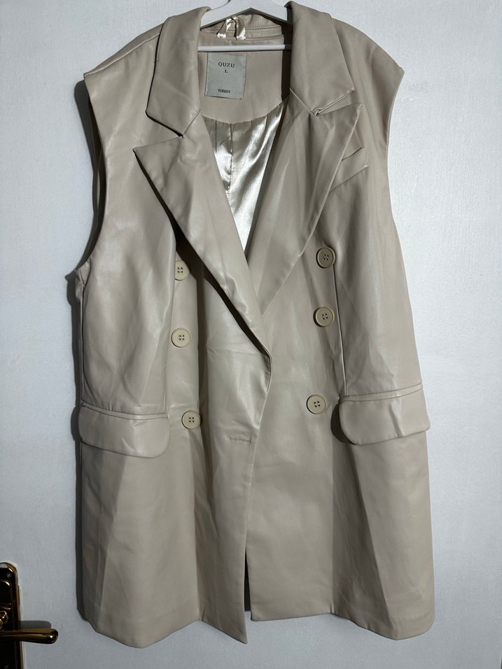 Düğmeli ön kısmı ve kesik yaka detayı olan bej renkli deri yelek, midi boy ve rahat kesimlidir.