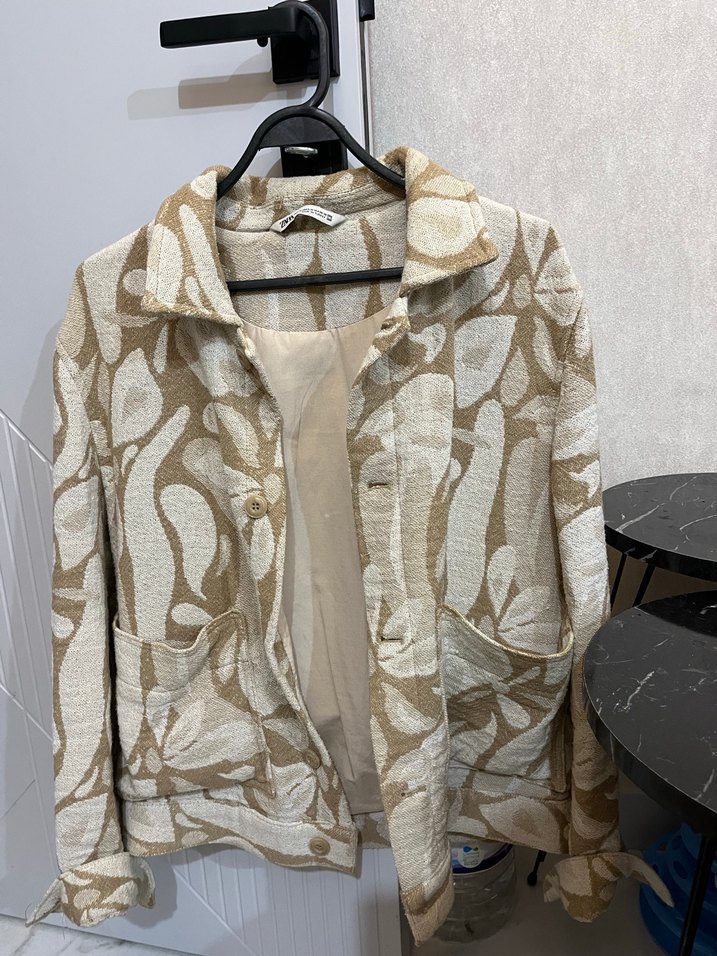 Düğmeli, kadın ceket, uzun kollu. Desenli ve bol kesim, günlük sokak modasına uygun. Ürünü iyi duruma deformesi falan yok.