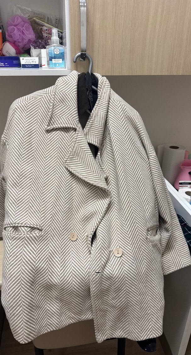 Uzun, bej renkli hamile kabanı; düğmeli, notched yakalı ve desenlidir. Uzun kollu, regular fit ve trend sokak stilindedir.