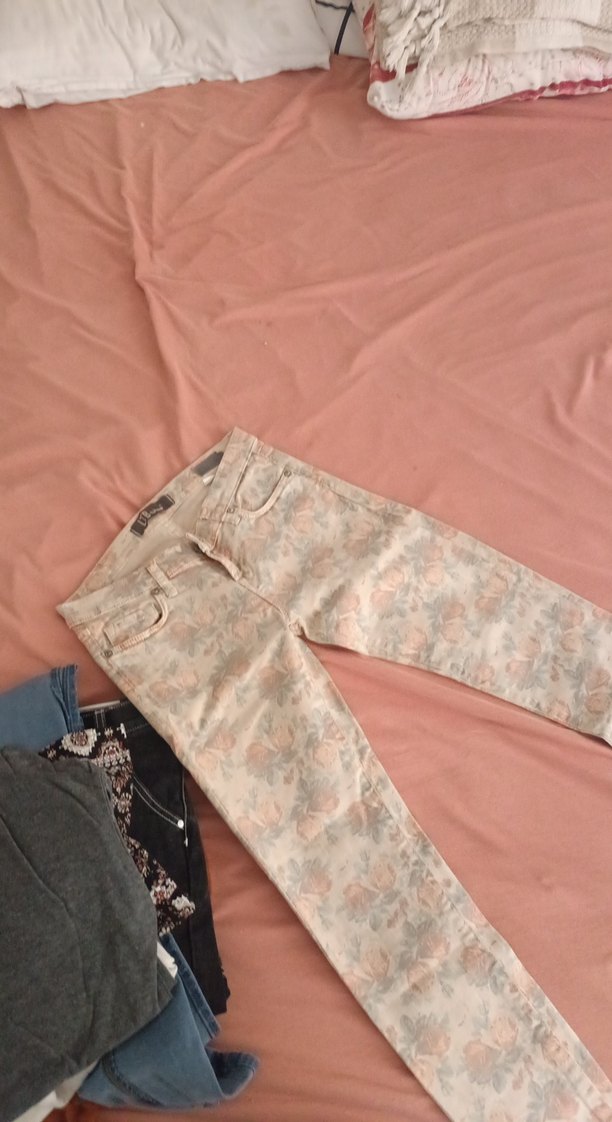 Düğmeli, bej renkli, desenli ve normal boy kadın pantolon, rahat tekstil kumaştan, günlük kullanıma uygun. çok güzel duruyor
