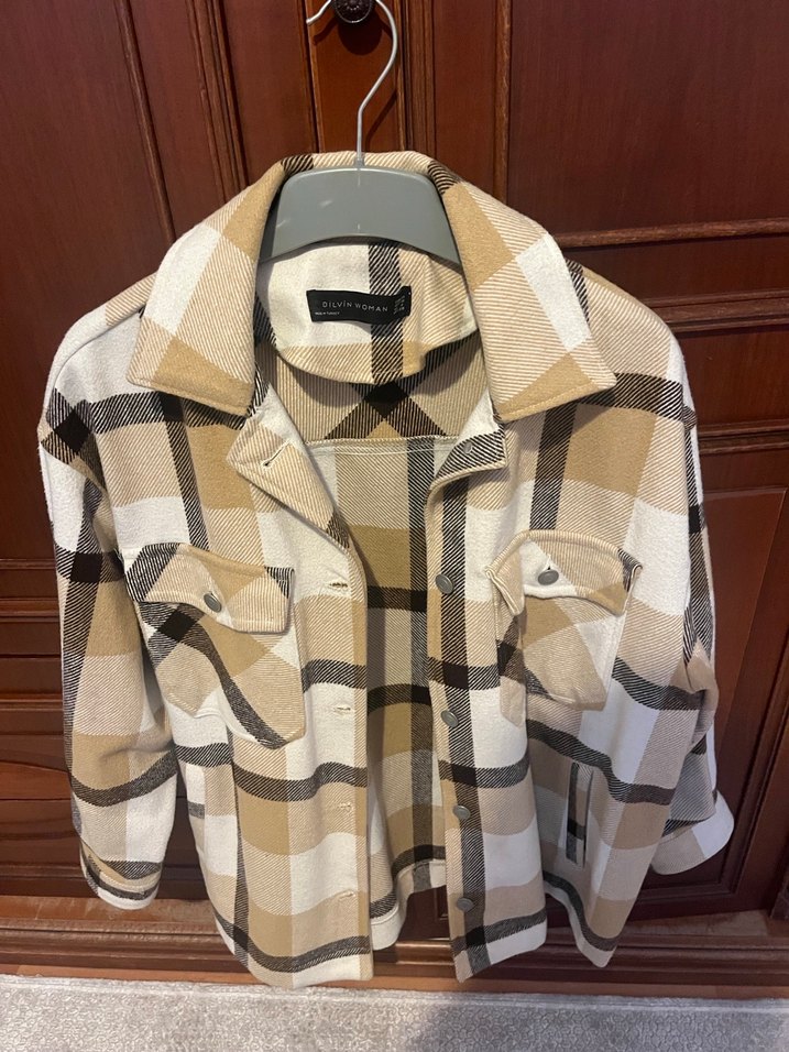 Düğmeli, uzun kollu bej ekose kadın gömlek. Notlu yakalı, midi boy ve rahat kesim, sentetik kumaştan üretilmiştir.