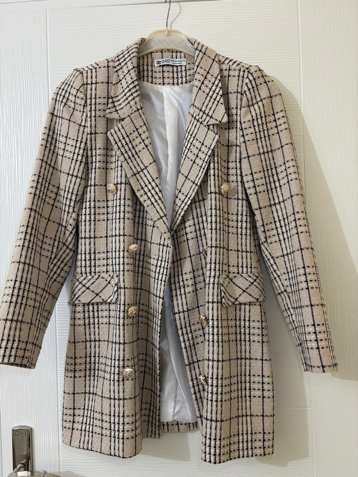 Bej ekose desenli, düğmeli, normal kesim ve midi uzunlukta, uzun kollu blazer. Günlük kullanıma uygun şık bir parça. Tüvit kumaştır