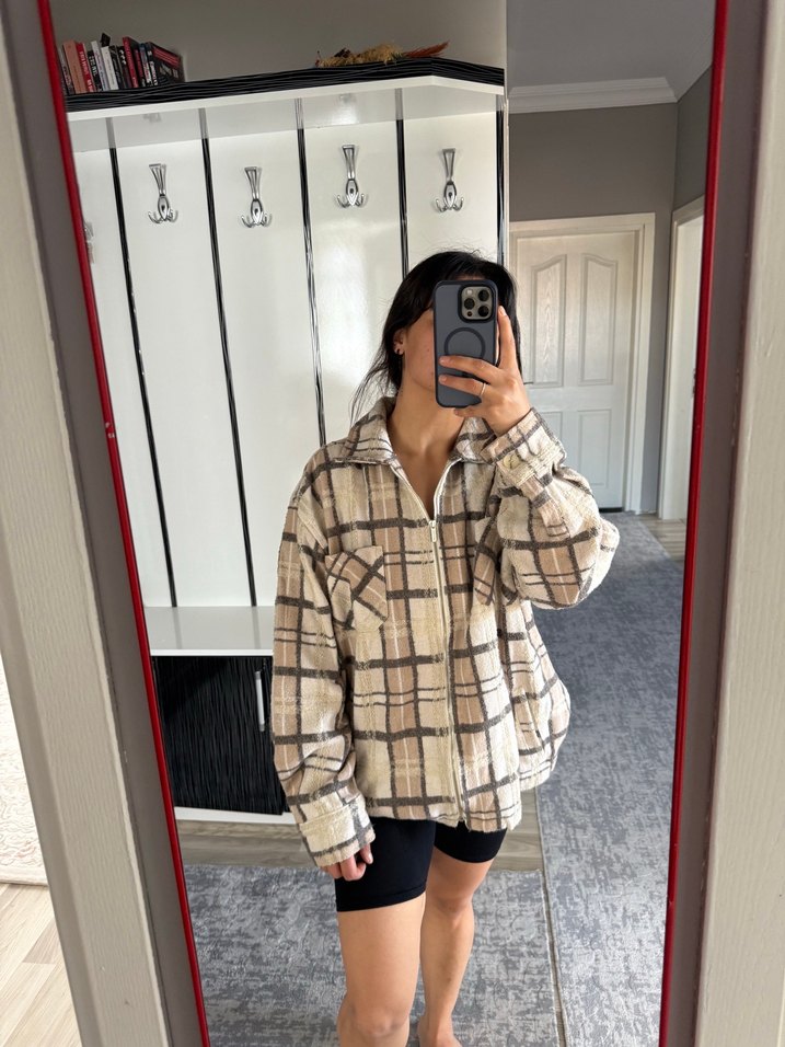 Düğmeli Bej Ekose Midi Ceket
