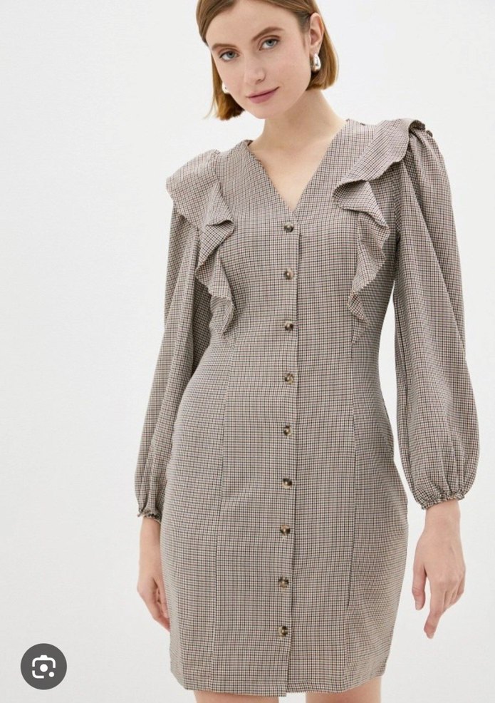 Bej ekose desenli, uzun kollu, düğmeli ofis elbisesi. Bana hediye gelmişti ama tarzım olmadığı için kullanamadım
